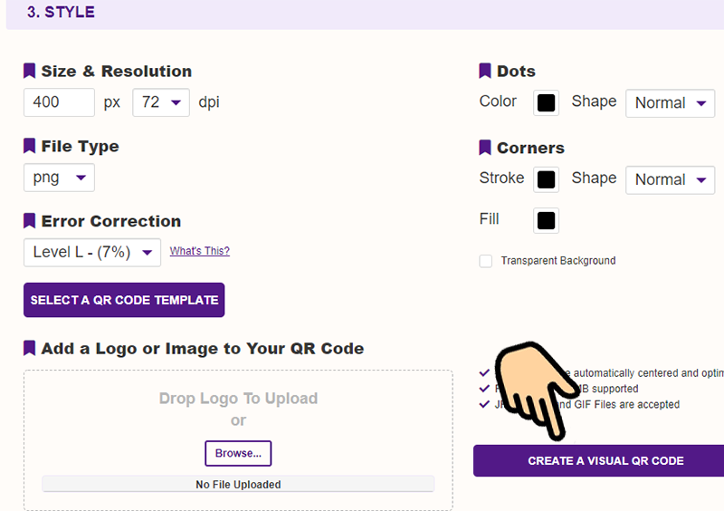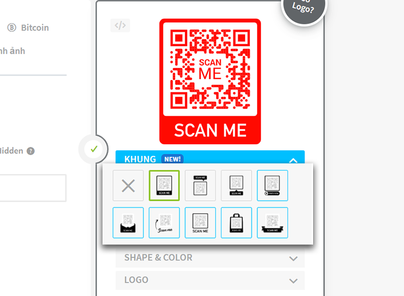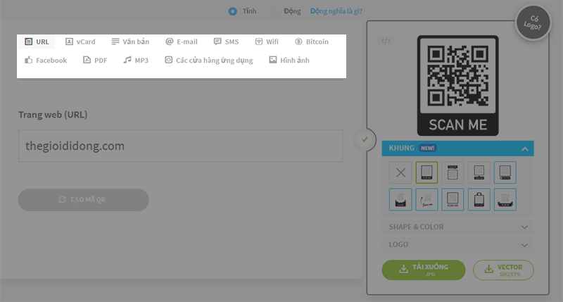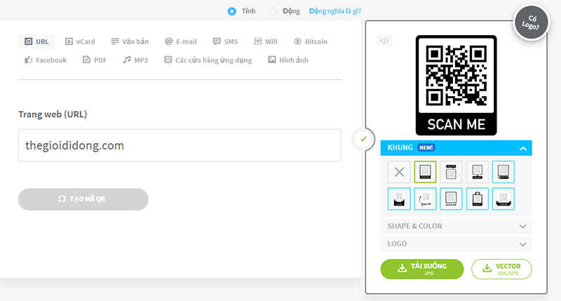 Bước 4: Tuỳ chỉnh thiết kế mã QR (màu sắc, thêm logo, chọn hình dạng góc bo tròn hoặc vuông).