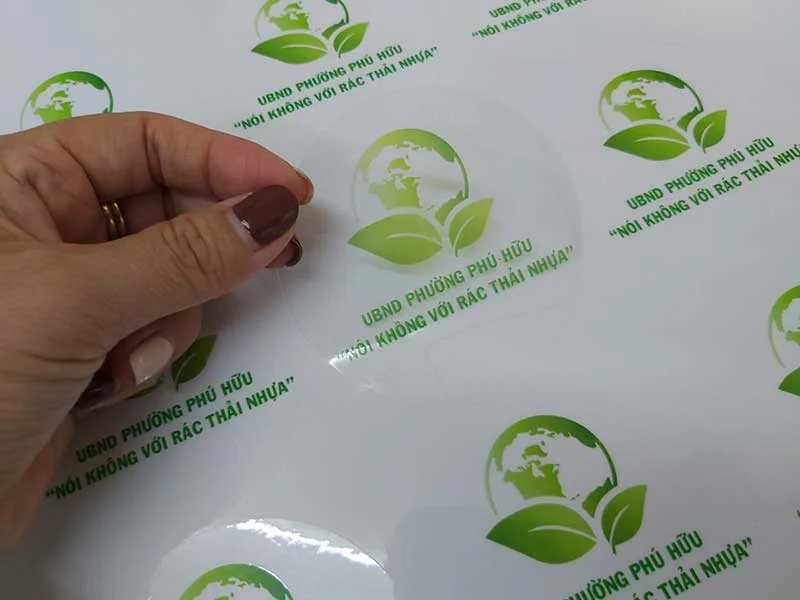 Decal nhựa trong suốt: Không màu, cho phép nhìn xuyên qua, thường dùng để dán lên bề mặt kính hoặc sản phẩm cần giữ nguyên màu nền.